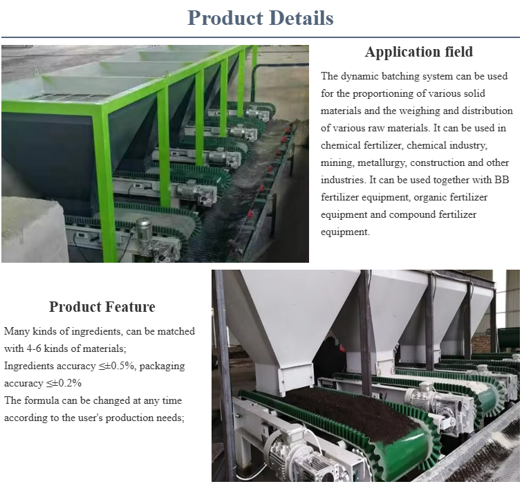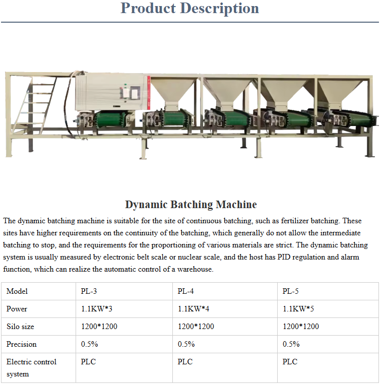 The dynamic batching machine is suitable for the site of continuous batching, such as fertilizer batching. These sites have higher requirements on the continuity of the batching, which generally do not allow the intermediate batching to stop, and the requirements for the proportioning of various materials are strict. The dynamic batching system is usually measured by electronic belt scale or nuclear scale, and the host has PID regulation and alarm function, which can realize the automatic control of a warehouse.