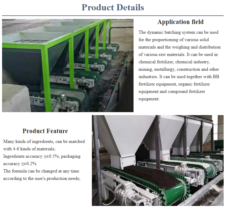 The dynamic batching machine is suitable for the site of continuous batching, such as fertilizer batching. These sites have higher requirements on the continuity of the batching, which generally do not allow the intermediate batching to stop, and the requirements for the proportioning of various materials are strict. The dynamic batching system is usually measured by electronic belt scale or nuclear scale, and the host has PID regulation and alarm function, which can realize the automatic control of a warehouse.